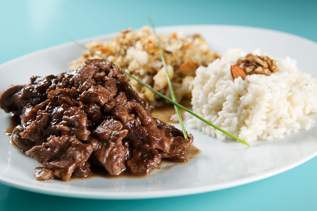 Prato principal – Filé ao molho de tamarindo, farofa de castanhas e arroz aromatizado – Filé mignon cortado em tiras com molho de tamarindo e anis estrelado. Acompanha farofa crocante com ervas finas e castanhas do Brasil e arroz aromatizado
