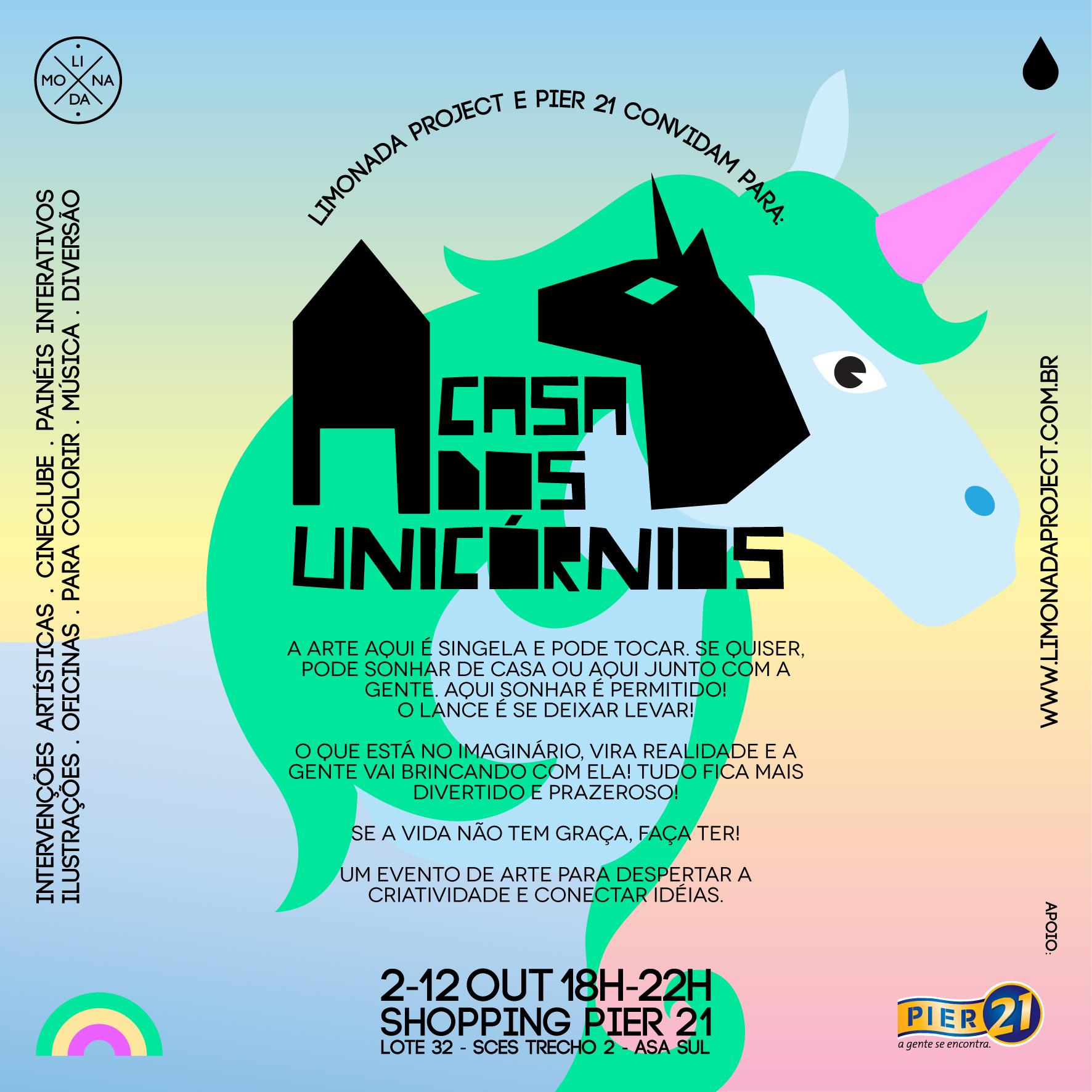 A Casa dos Unicórnios ganha temporada de estreia no Shopping Pier 21 de 2 a 12 de outubro. Um universo lúdico, mágico e criativo une arte, entretenimento e criatividade em um ambiente mágico. A ideia é despertar da criatividade das crianças e incentivar a conexão de idéias. Fugir por um momento da realidade e entrar em um mundo colorido e cheio de fantasia, onde a criatividade será estimulada de todas as formas.