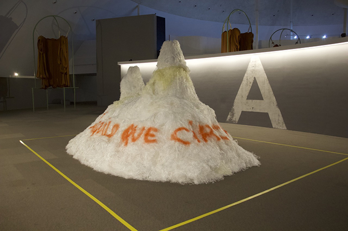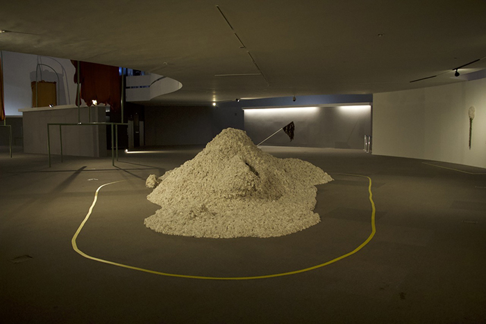 Matérias-primas industriais nobres, utilizadas em processos de fabricação de diversos produtos do nosso cotidiano. Assim, mantas de poliéster, aço e borracha, fardos de algodão não beneficiado, argila, couro, entre tantos mais, ganham vida a partir do engenho do artista, que imprime diversas camadas de significados às grandes esculturas que ora apresenta no museu brasiliense.