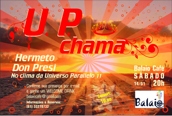 Hoje tem samba do bom no Balaio Café, com o Grupo Vizinhança, que promete agitar as esquinas da 201 norte de 18 às 22 horas. O couvert custa R$ 10,00 e quem quiser pode esticar para a festa UP Chama, uma celebração que homenageia a última Universo Paralello, que rolou na Bahia no início do ano. Nas pick ups, os DJs Hermeto e Don Presi. Quem confirmar presença pra UP Chama, via mail, ganha um welcome drink, envie mensagem com seu nome para balaiocafe@gmail.com.