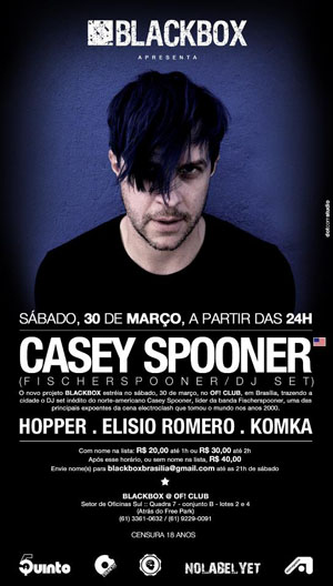 Tem projeto novo de música eletrônica em Brasília. O BlackBox vai trazer nomes descolados da cena, sempre aos sábados. A estreia rola no dia 30 de março, no OF! Club e traz um convidado de peso, Casey Spooner, líder da banda Fischerspooner, que apresenta DJ set inédito.