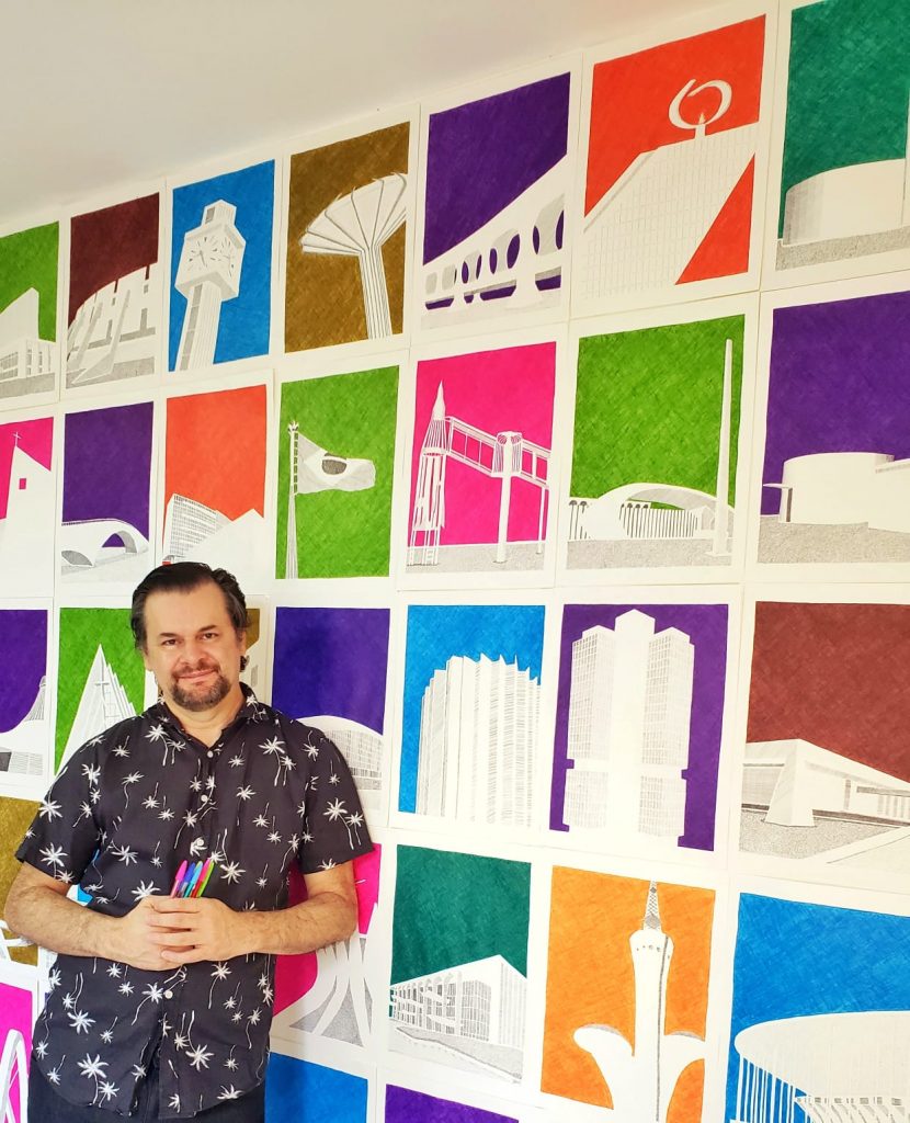 “As obras apresentam um ponto turístico retratado em duas tonalidades. A cor viva representa o céu icônico da cidade. A neutra, revela detalhes do monumento, num efeito de Gestalt que brinca com os elementos de luz, sombra, figura, fundo e ângulo”, explica o artista.