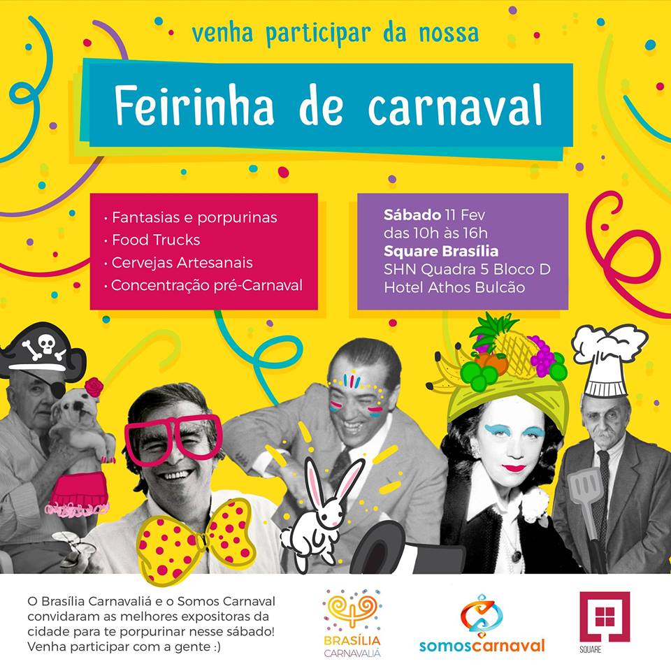 Uma iniciativa bacana visa se preparar para os blocos de pré-carnaval neste sábado (11 de fevereiro). O Brasília Carnavaliá e o Somos Carnaval convidaram diversos expositores da cidade para quem deseja um look descolado para o Carnaval. Fantasias, purpurinas, food truks, cervejinhas e uma playlist especial ocupam a Square Brasilia: