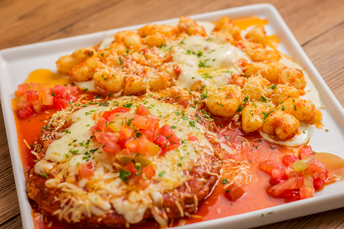 Filé a Parmegiana do Chef com nhoque de tomate e molho cremoso de parmesão.