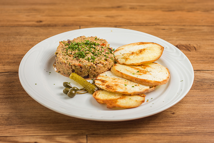 Tartar de Carpaccio a Fiorentina acompanhado de torradas.