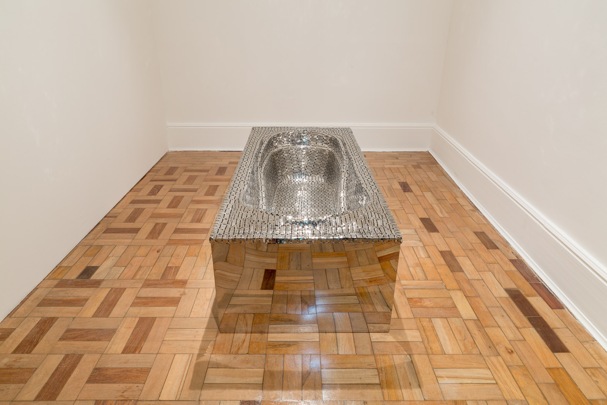 Tayeba Begum Lupi (1969) – Nascida em Bangladesh, Tayeba Begum Lupi lida em seu trabalho com questões relativas ao universo feminino e as tensões de gênero. Na obra “Vamos dar um tempo”, a artista reverbera, por meio da apropriação de materiais cortantes como a lâmina de barbear e os alfinetes de segurança, problemas da violência real enfrentada pelas mulheres ou aqueles baseados em estereótipos de sensualidade e dominação, aos quais são submetidas.
