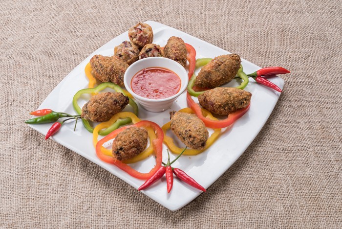 Eu quero é ver o oco (bolinho de filé de peito de frango recheado com lingüiça suína caseira picante e servidos com molho da casa)