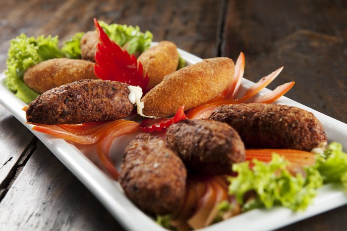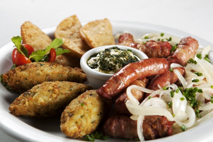 Bolinho de risoto e linguiça – Bolinho de risoto recheado de requeijão, acompanha linguiça com cebola e tomate