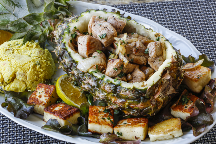 Pernil acebolado servido no abacaxi com requeijão. Acompanha farofa de abacaxi com bacon e queijo coalho.