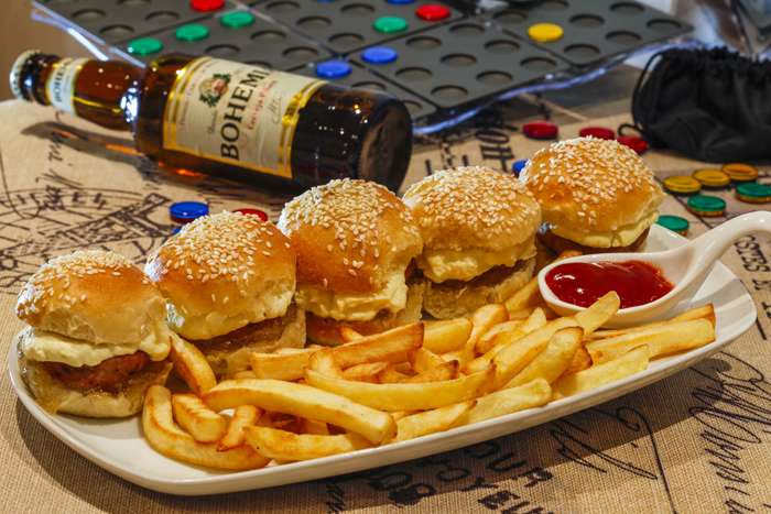 Cinco mini hambúrgueres artesanais de filezinho suíno, com geleia de abacaxi levemente picante e cream cheese.