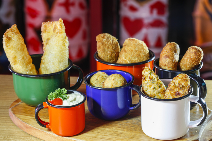 Combinação em forma de surubis com pastel, bolinho de arroz com pernil, croquete de carne, bolinho de bacalhau e risole de carne de sol com nata.