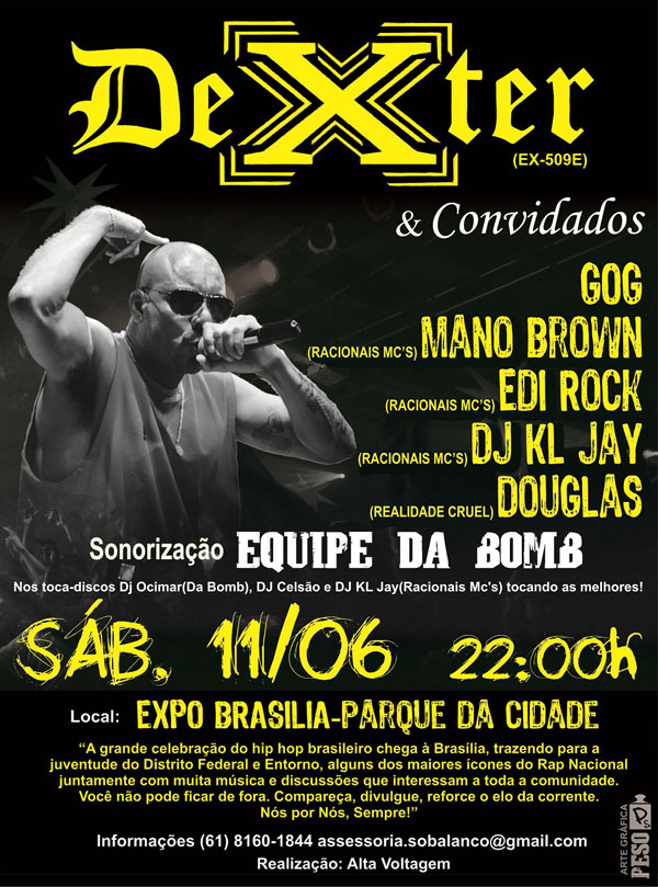 A noite musical Dexter & Convidados acontece neste sábado (11 de junho) às 22 horas no Expo Brasília do Parque da Cidade e traz show do Dexter com GOG, Mano Brown, Edi Rock, Douglas e DJ KL Jay. A sonorização fica à cargo dos DJs Ocimar, Celsão e KL Jay.