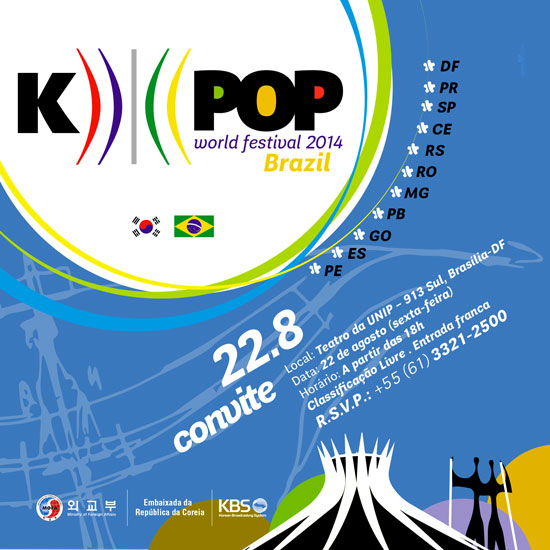 O K-Pop Festival 2014 Brazil acontece no dia 22 de agosto (sexta) no Teatro da UNIP, em uma parceria com a Embaixada da Coréia. O Festival é um concurso de canto e dança do gênero K-Pop, abreviação de música popular coreana, fenômeno musical que mistura vários ritmos como o rock, dance, eletrônico e pop, que virou febre no mundo inteiro.