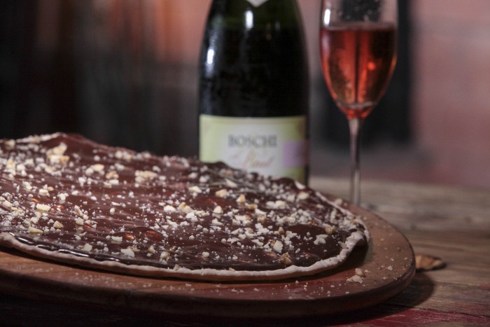 Para encerrar a noite, a sugestão da casa é experimentar as pizzas doces acompanhadas de um espumante brasileiro. A Nutella (R$41,90, pequena e R$57,90, grande) é uma pizza de massa crocante com calda de Nutella, sorvete de creme e nozes picadas; e a Paçoquita (R$33,90, a pequena e R$39,90, grande), feita com massa crocante, muçarela, paçoca, doce de leite e sorvete. Segundo o sommelier, ambas as opções harmonizam muito bem com o Rio sol Brut Rose (R$59) – a bebida apresenta um sabor cítrico ideal para equilibrar com o doce das pizzas.