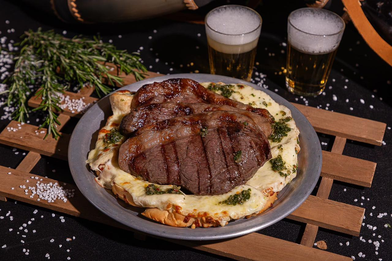 O prato traz a exclusiva picanha de sol da casa, maturada, escoltada com delicioso pão de alho. O preço padrão é R$ 149,00 e une custo e benefício como combinação perfeita para ser compartilhada entre amigos.