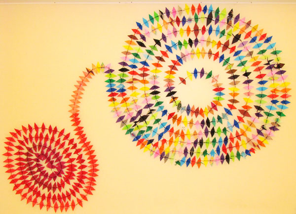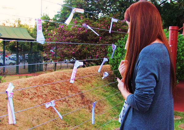 Um varal chamado “Omikuji” (ou “loteria sagrada”) traz tiras de papel onde o público pode escrever uma mensagem, assim como nos santuários xintoístas ou templos budistas no Japão. Há também uma cortina tradicional japonesa chamada de “Noren”, divida em três partes e decorada com tsurus feitos com dobraduras de papel reciclado (origami).