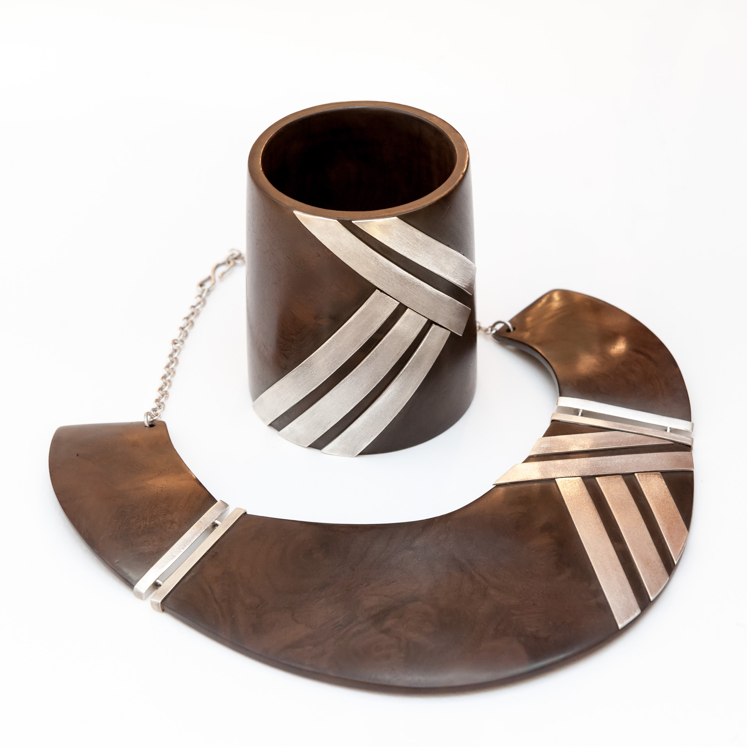 1 – Colar e bracelete (Pará) Ourives. Madeira e prata escovada inspirado nos assurini. Criação de Marcilene Rodrigues. Trabalho de madeira do mestre Eugênio. 2 -Lãpura (Rio Grande do Su) com design de Ronaldo Fraga.