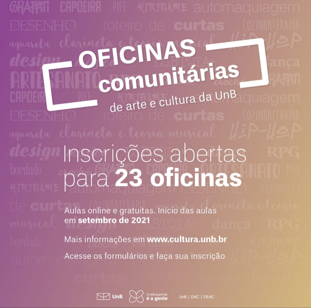 Estão abertas as inscrições para 23 Oficinas Comunitárias, a serem ministradas por estudantes da Universidade de Brasília. Serão na forma online, gratuitas e destinadas à toda a comunidade: interna e externa à Universidade. Para participar, basta acessar o link e se inscrever. As inscrições vão até a primeira semana de setembro de 2021. E as aulas começam na semana do dia 6 de setembro de 2021.