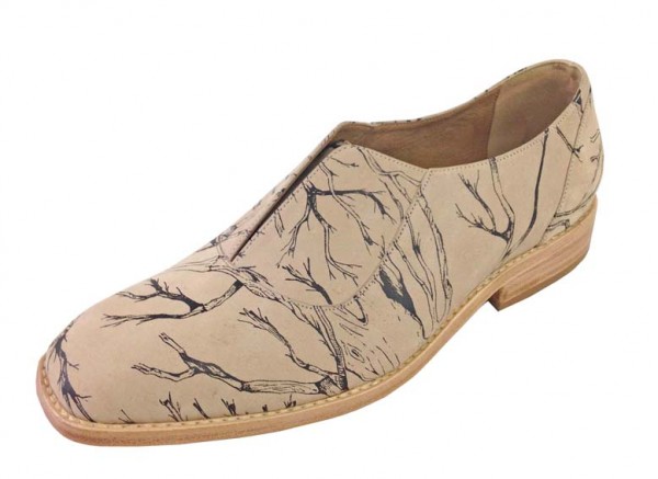 Obra aberta – Dois modelos de calçados apresentam silk sobre o couro semi-acabado. Virgínia convida o público a colorir seu próprio calçado.